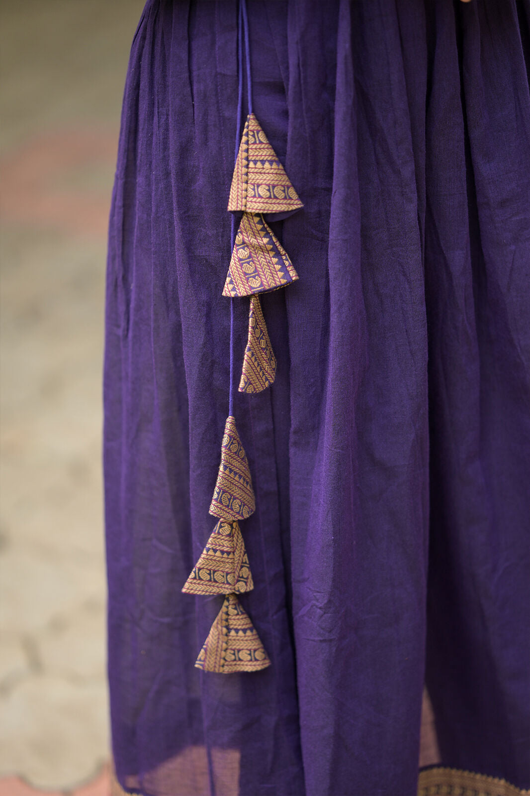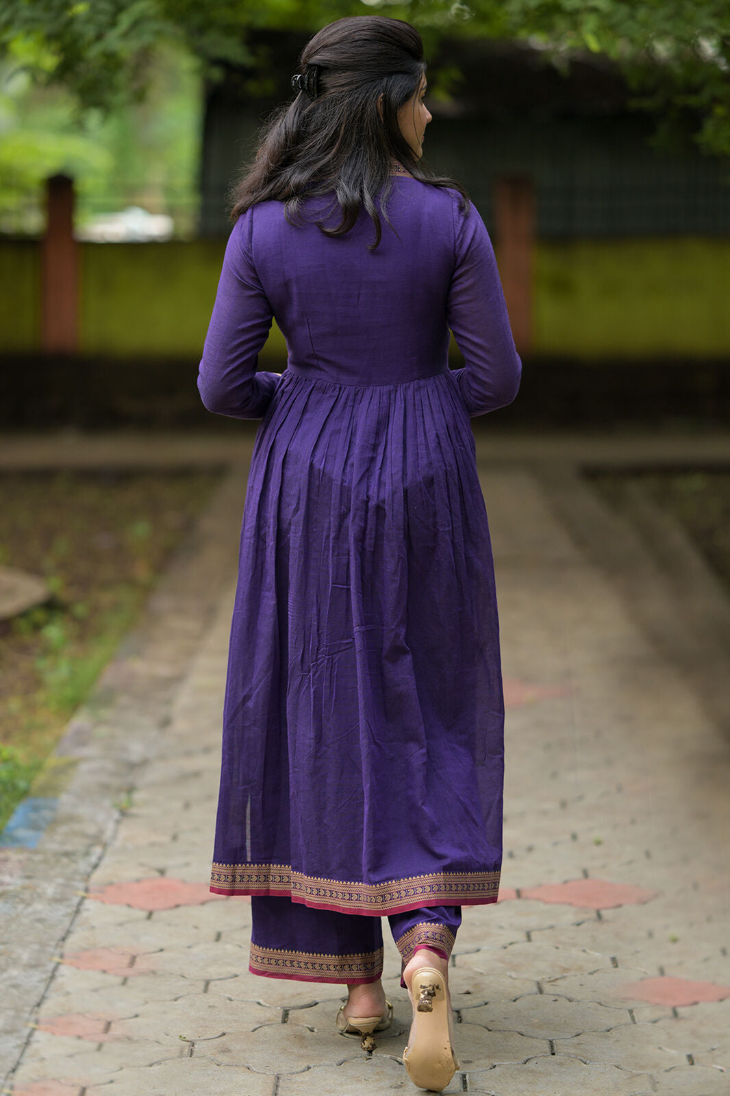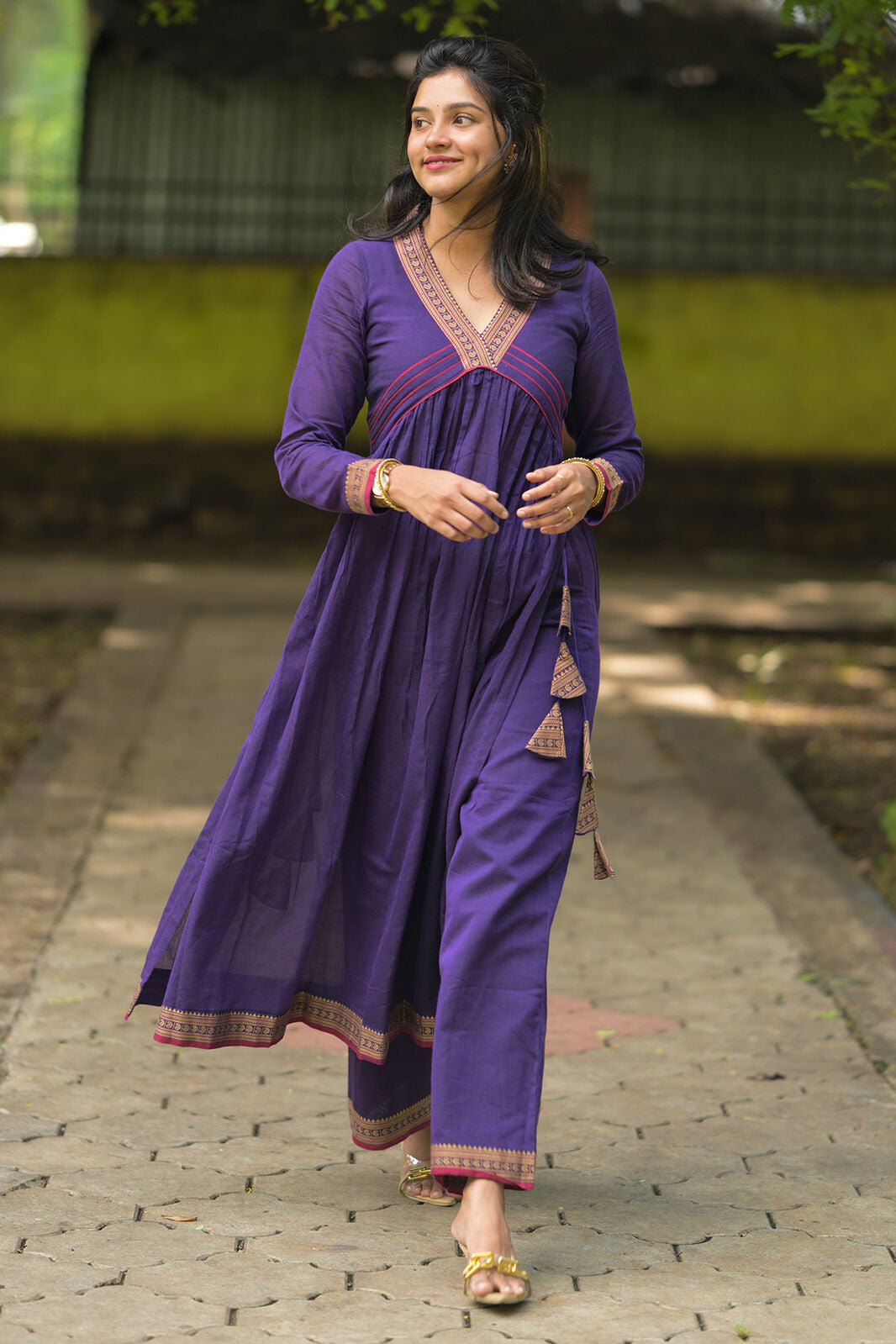 Embrace the fusion of style and comfort with this Violet Kurta set, crafted in Pure Handloom, which is lightweight and comfortable on the skin. Pair it with a straight flair Plazoo pant featuring a border on the edges. It comes in full sleeves with a V-neckline, border detailing, piping on the yoke, and tassels on both sides. Complete this look with minimal oxidized accessories.