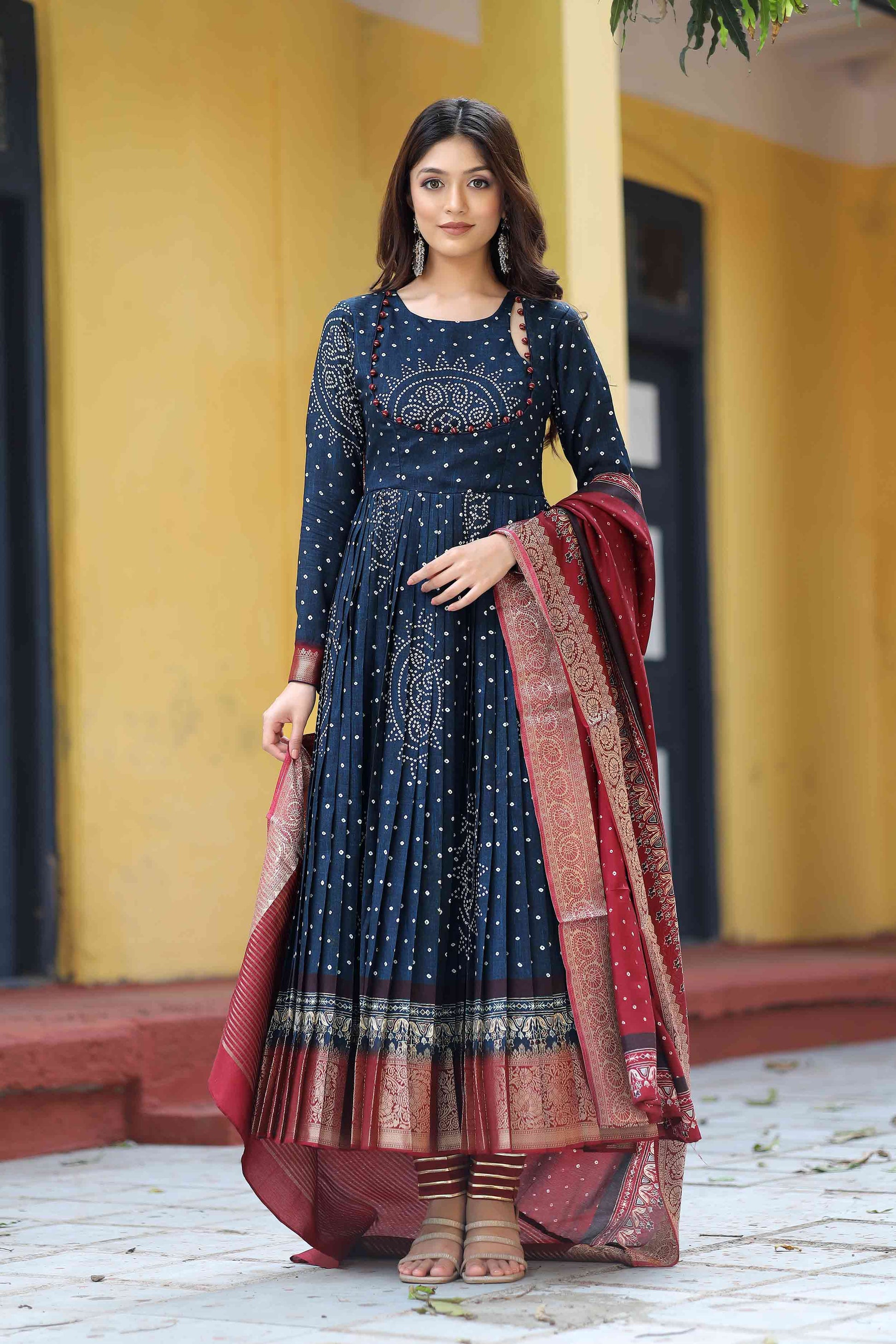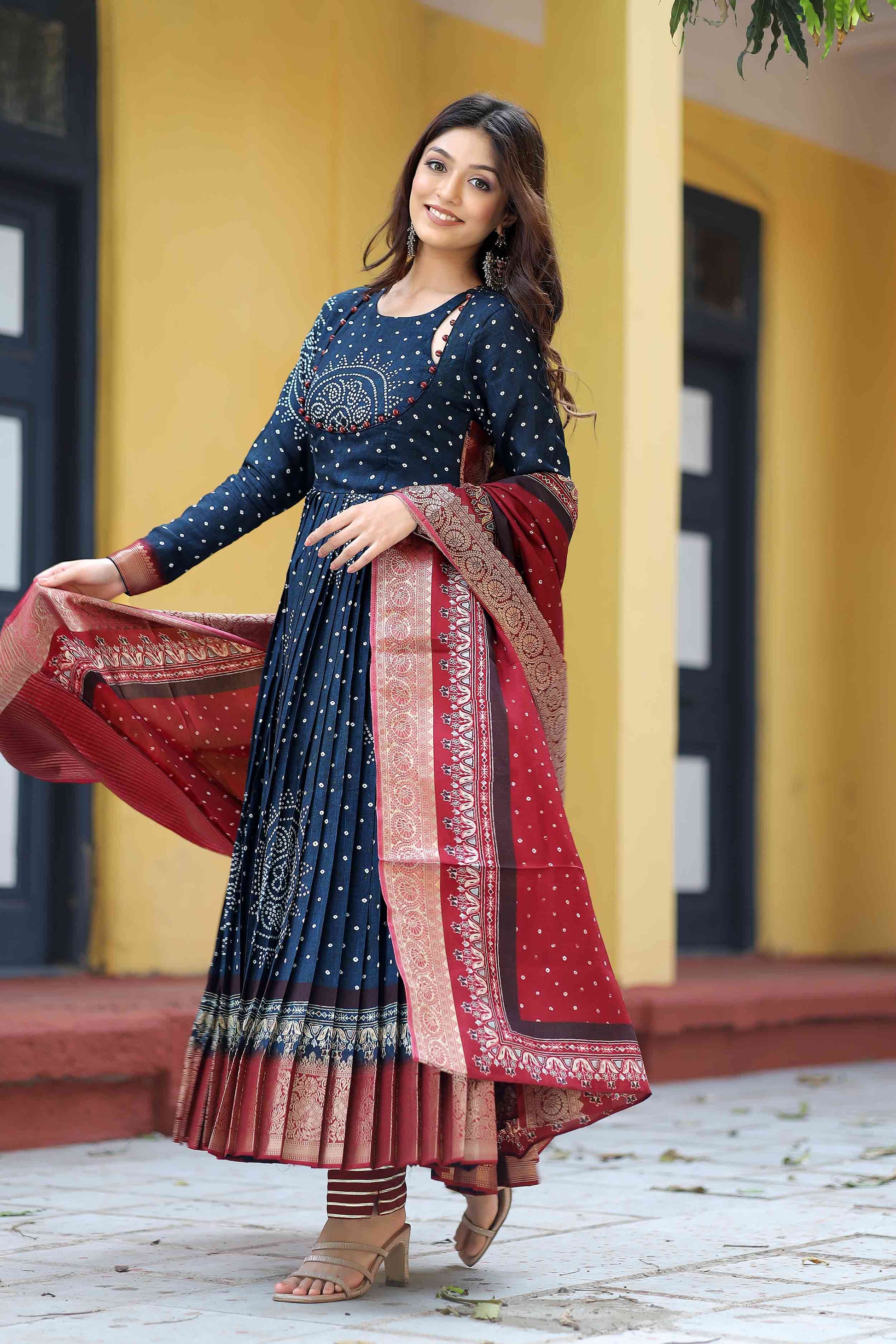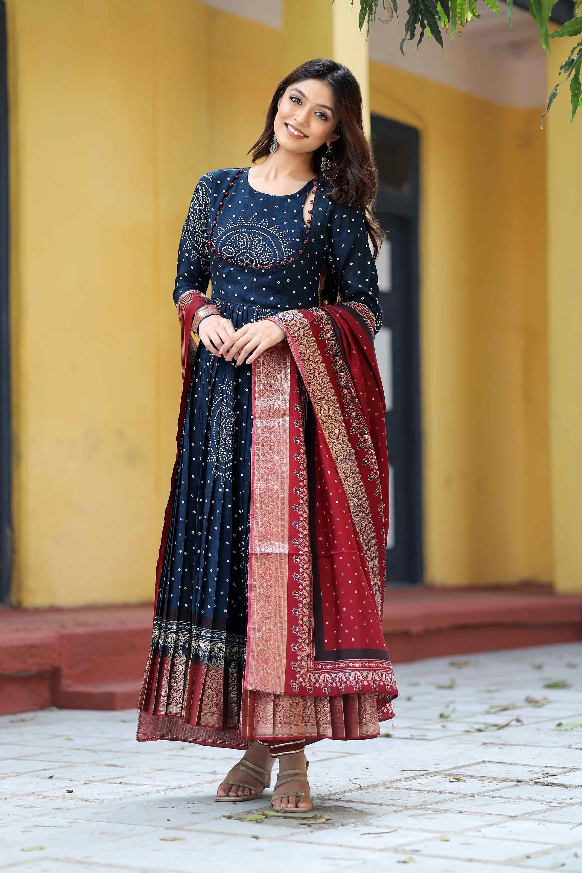 The Shayla Bandhani Anarkali with a Merrun Ajarakh dupatta exudes a captivating blend of tradition and contemporary style. Perfect for special occasions or cultural celebrations, this ensemble will make a statement while honoring India's rich textile heritage. They are designed in the same color as the Anarkali, offering a modern twist to the traditional attire.