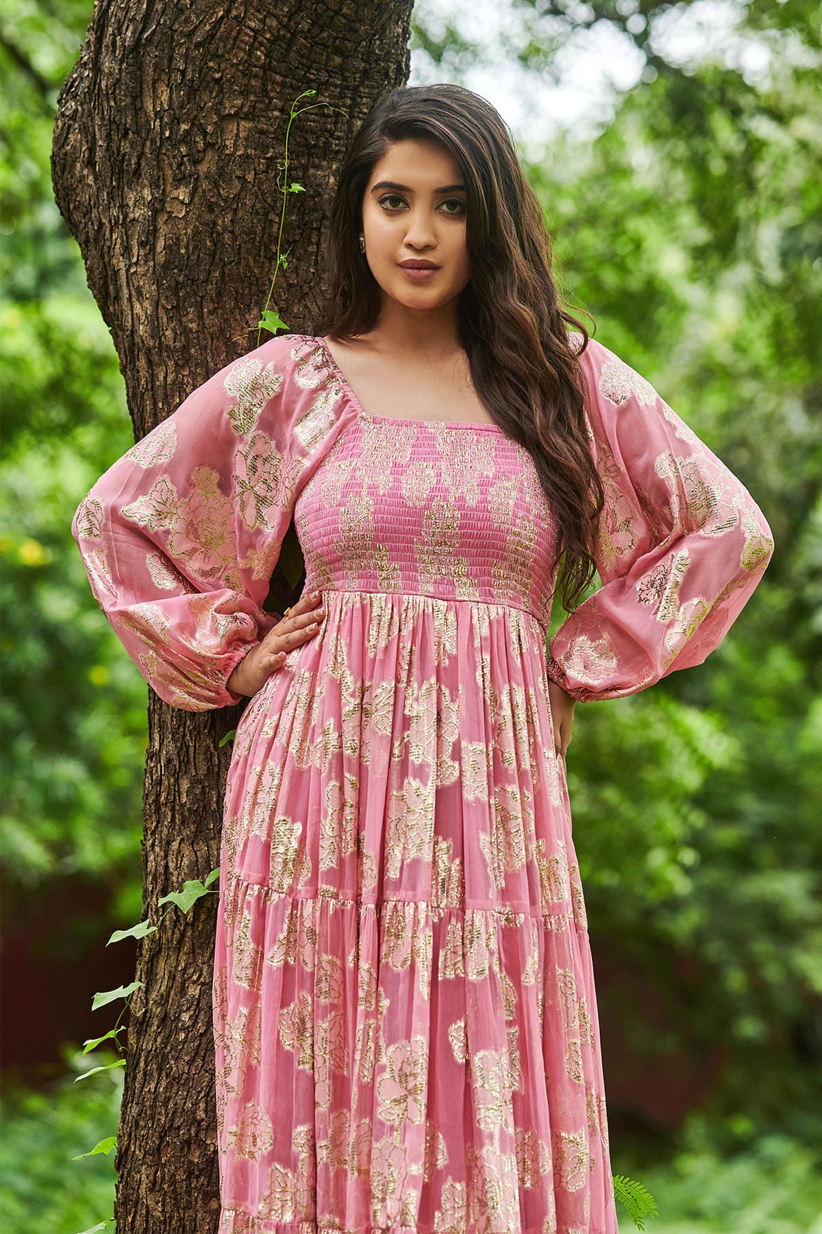 Would you be able to find something special yet comfy? You need this long flared midi dress in a beautiful Pink color. This Midi dress features a square neckline with trending Puff sleeves that are comfortable to move in. It features smoking elastic detailing on the yoke for perfect fitting. Wear this beautiful dress crafted in jacquard fabric. Style it with minimal jewelry.