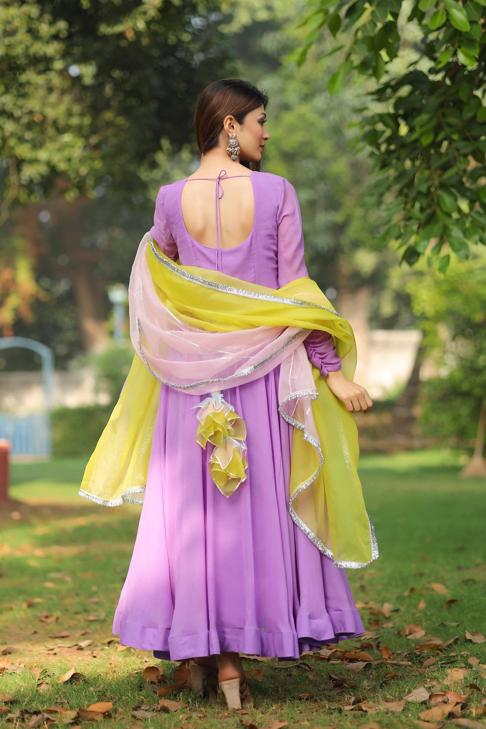 Embrace ethereal beauty with our sofiya Lilac Georgette Anarkali, adorned with authentic mirror embroidery on the yoke, showcasing meticulous craftsmanship. Accompanied by a multi-colored Organza Dupatta with exquisite gotta Zari work, this ensemble radiates elegance and charm. Perfect for festive occasions, it is a must-have piece that blends traditional artistry with contemporary style, ensuring you stand out in every gathering.