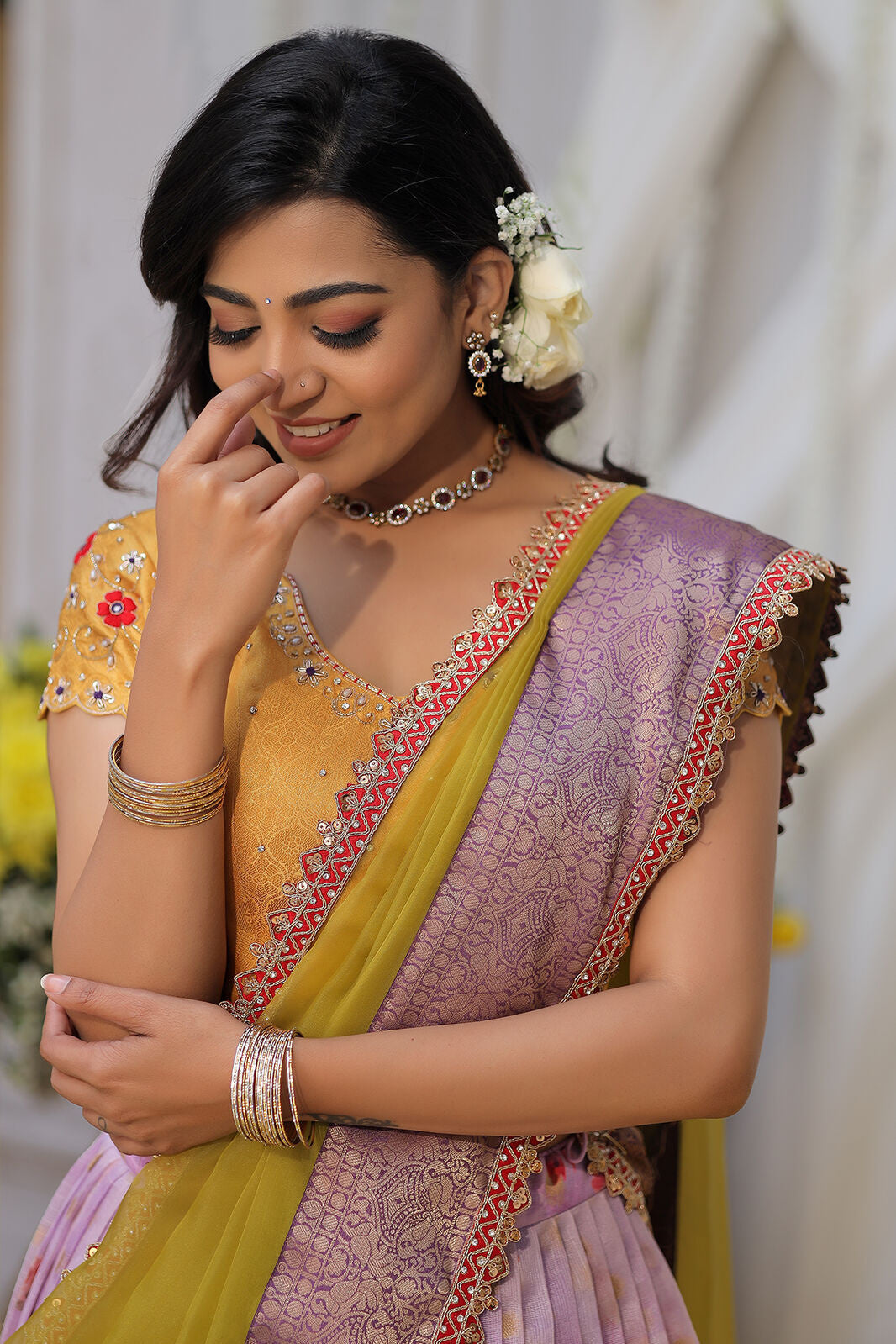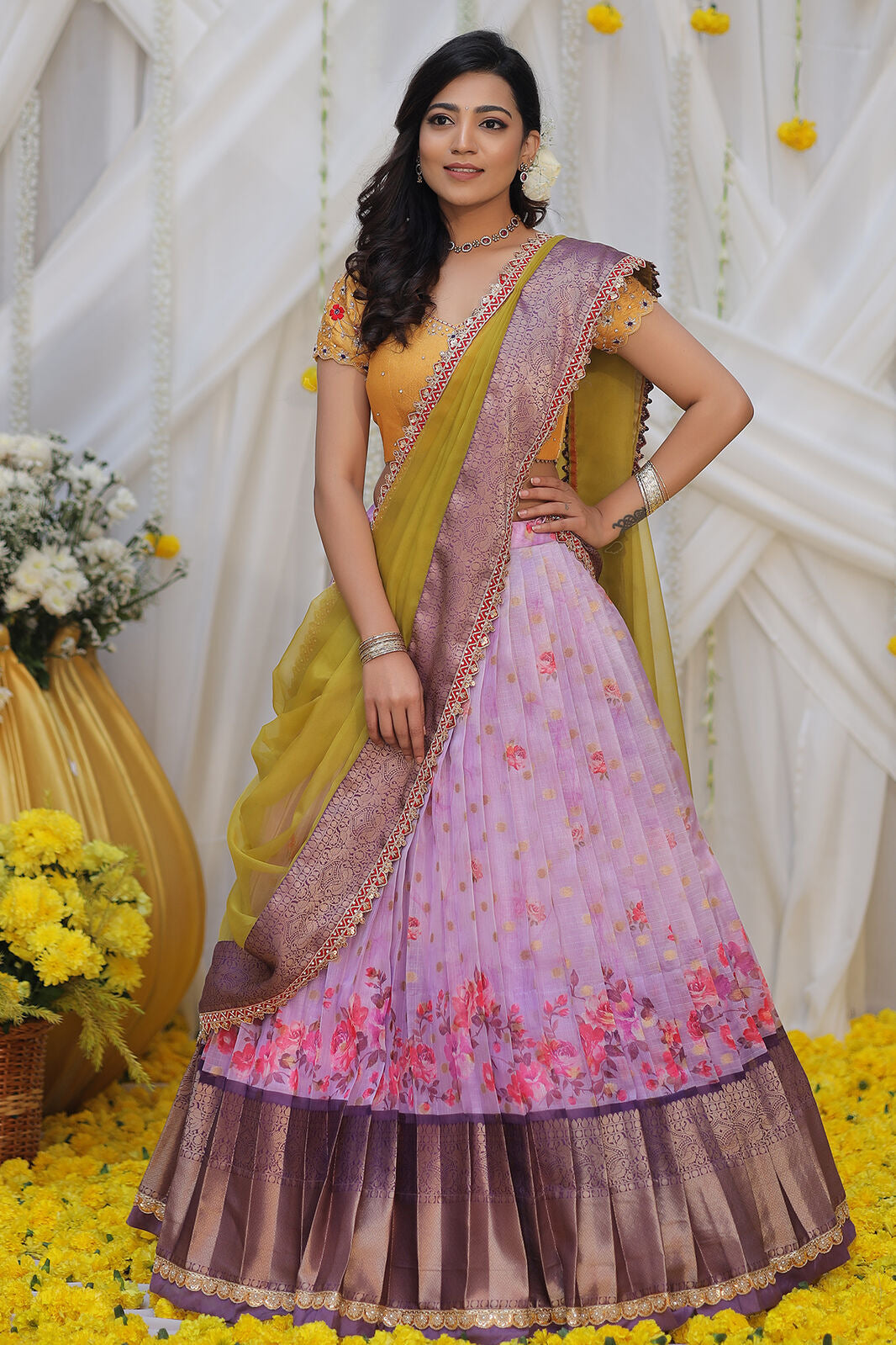 Elevate your festive wardrobe with this perfect neutral Pattu lehenga in lavender and yellow shades. It features floral print all over the lehenga with broad pattu at the edge. This three-piece has a perfect Pattu border organza dupatta with zarkhan lace detailing. The yellow blouse adds a traditional touch with intricate handwork and a beautiful neckline. This outfit is perfect for celebrations and special occasions.