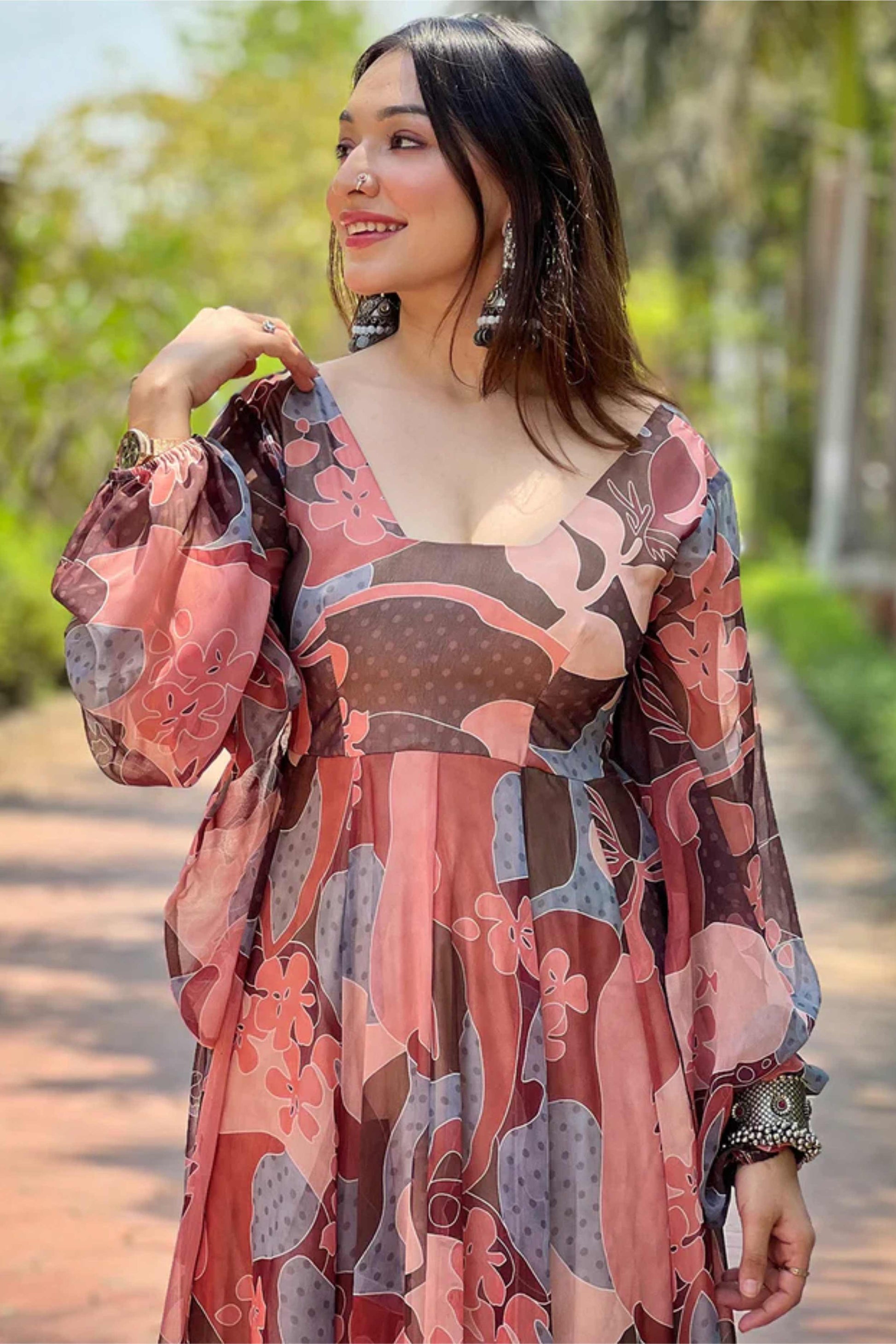 This Brown Color maxi dress is a perfect, pretty look. The contrasting colors complement each other. The Dress made in Georgette is refreshing, and the Full sleeve adds perfection to the Western look.