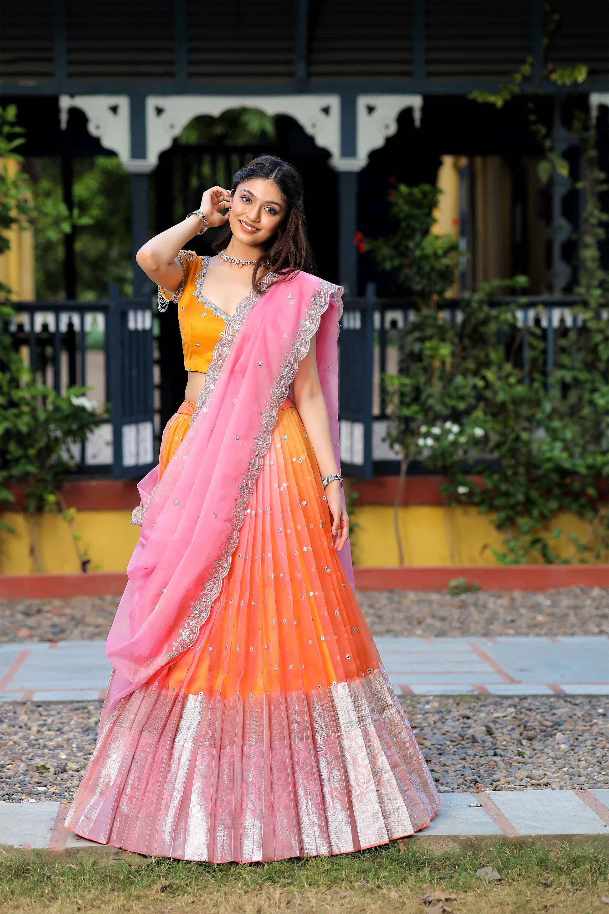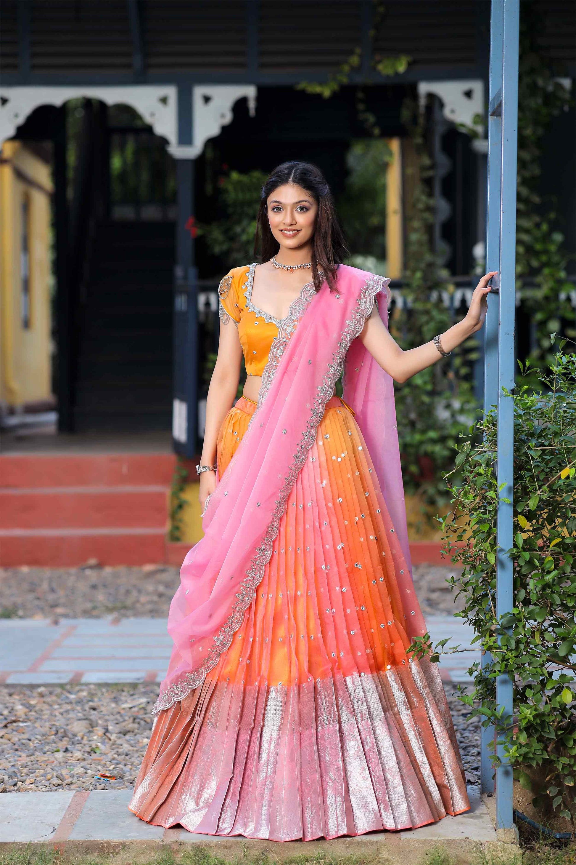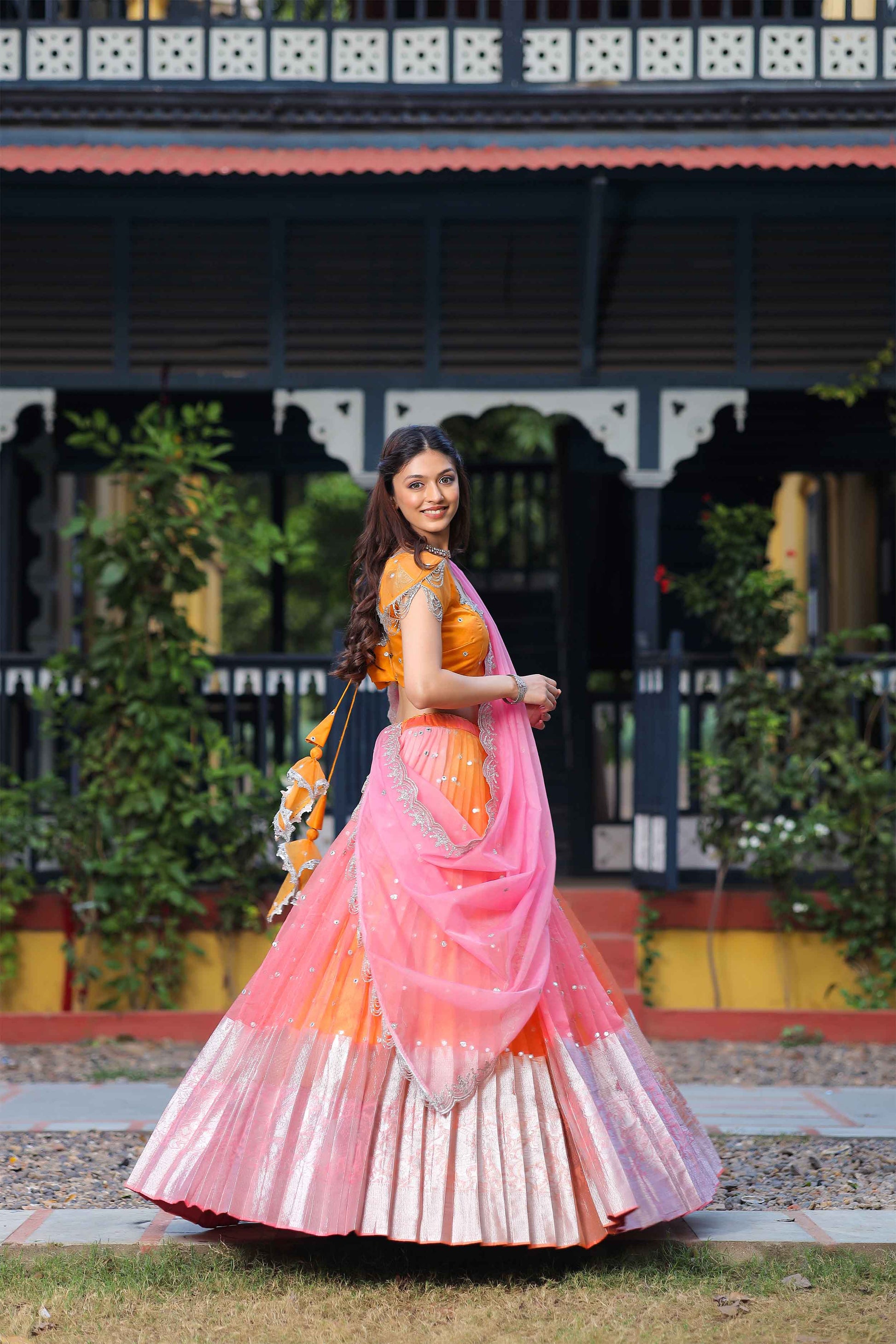 Draped in opulence, our Silver Elegance Tyohar Lehenga Set is a masterpiece that exudes timeless charm and luxury. Crafted with meticulous attention to detail, the lehenga is a work of art. Its base is adorned with intricate mirrorwork, creating a mesmerizing play of reflections as you move. The lehenga's voluminous flair and intricate zari border add an extra layer of grandeur. The blouse is designed with a modern twist, perfectly combining tradition and contemporary style.