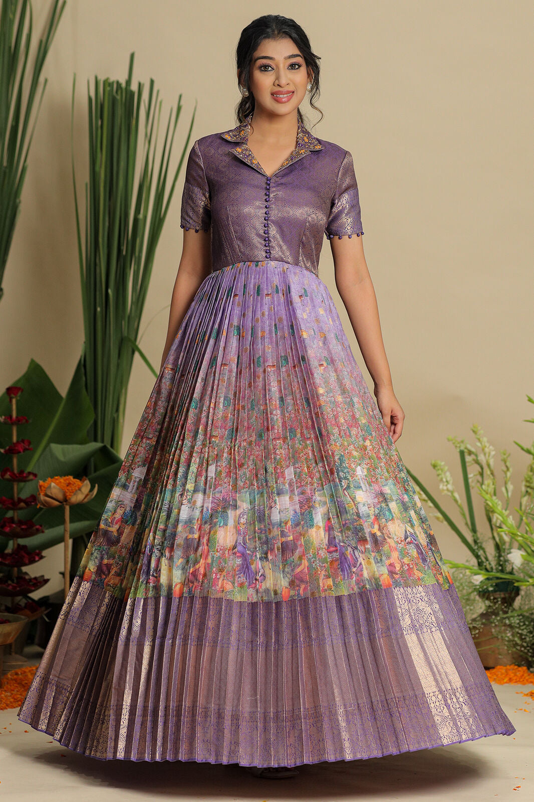 Luxury is at its best with this contemporary Kota Zari Pattu dress in lavender. It showcases elegant potli details on the yoke and one sleeve. The modern collar neckline features intricate hand embroidery, giving the entire dress a royal look. The broad Pattu border on the flair is adorned with a pleated floral print, adding a touch of elegance to this exquisite piece.