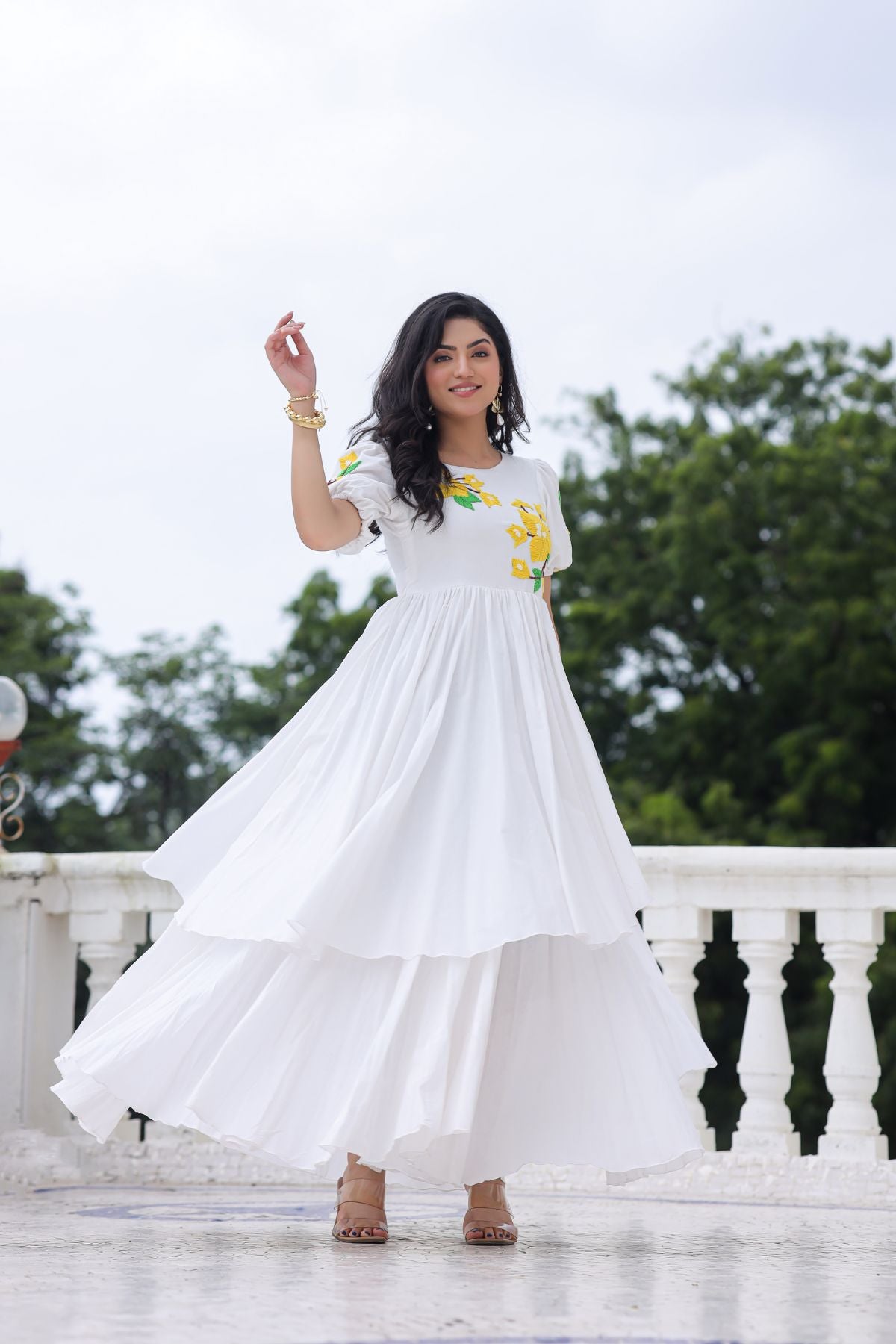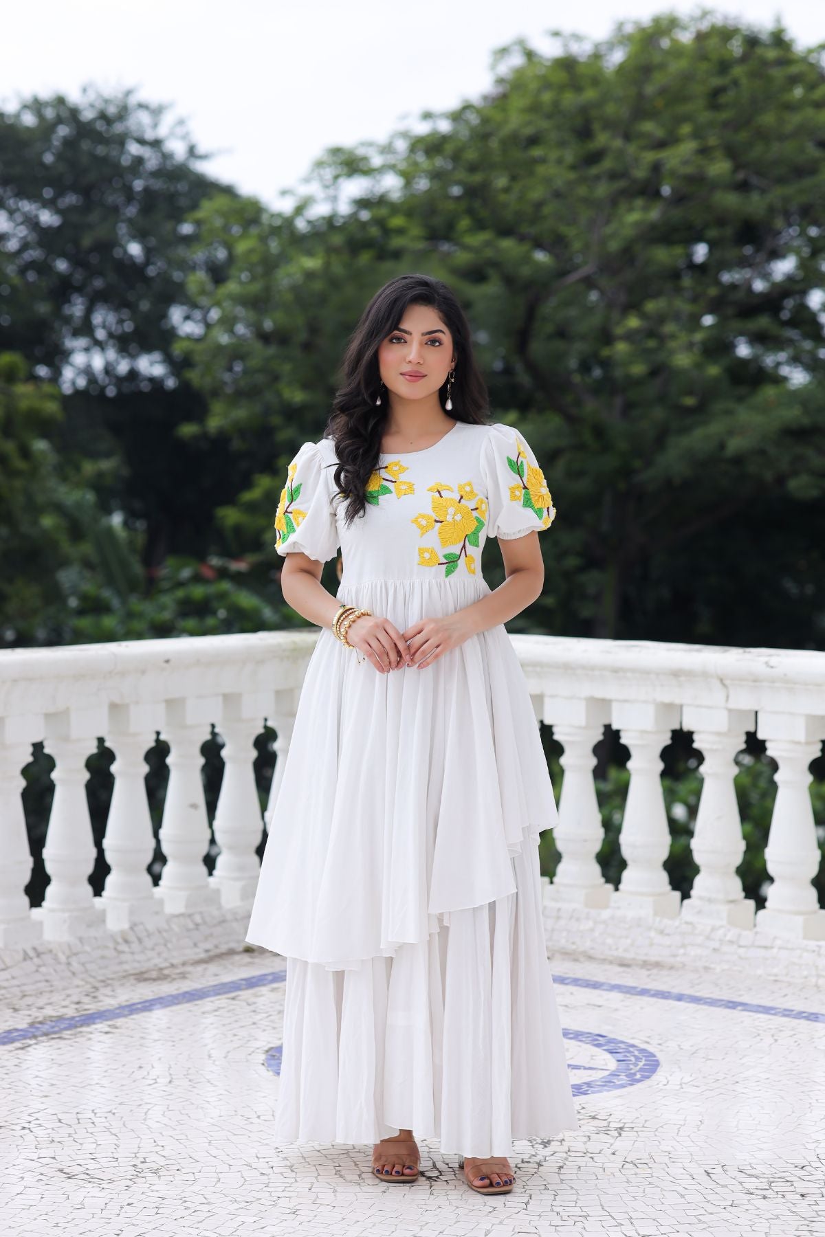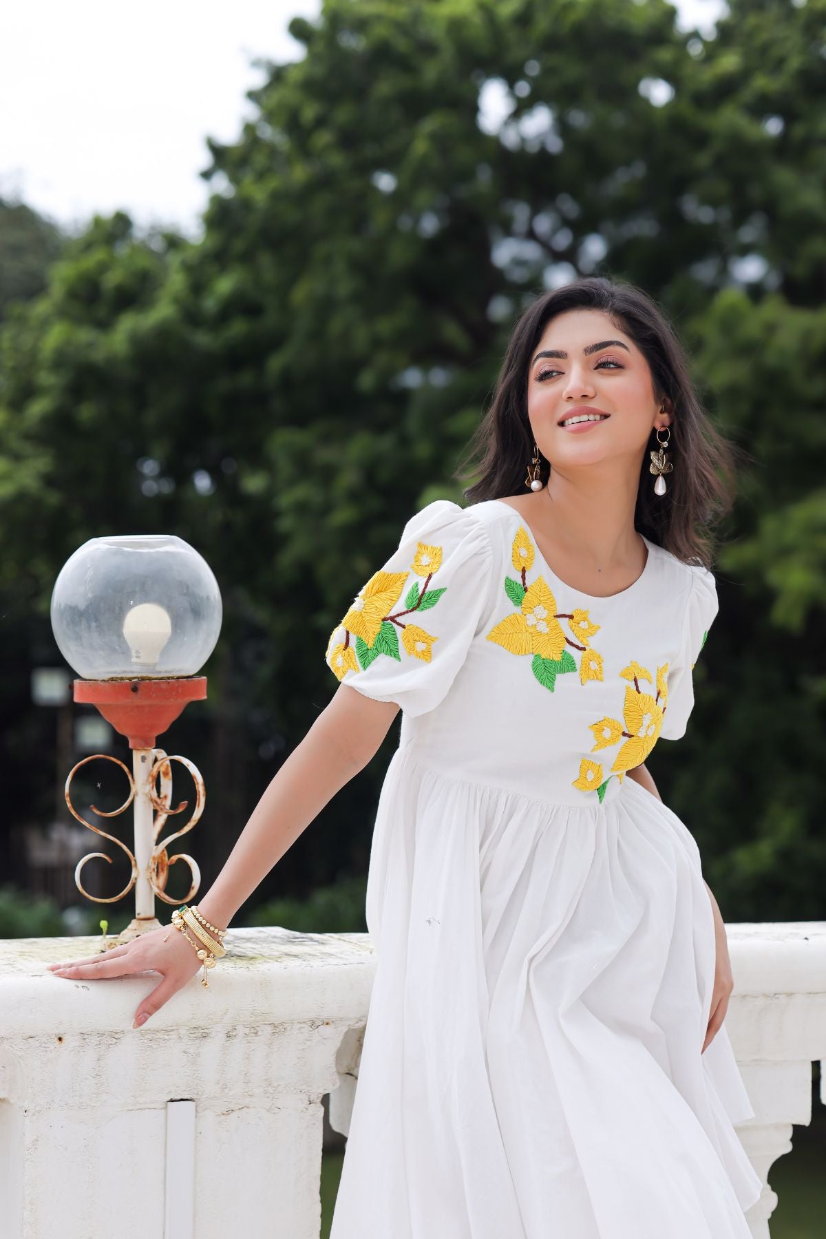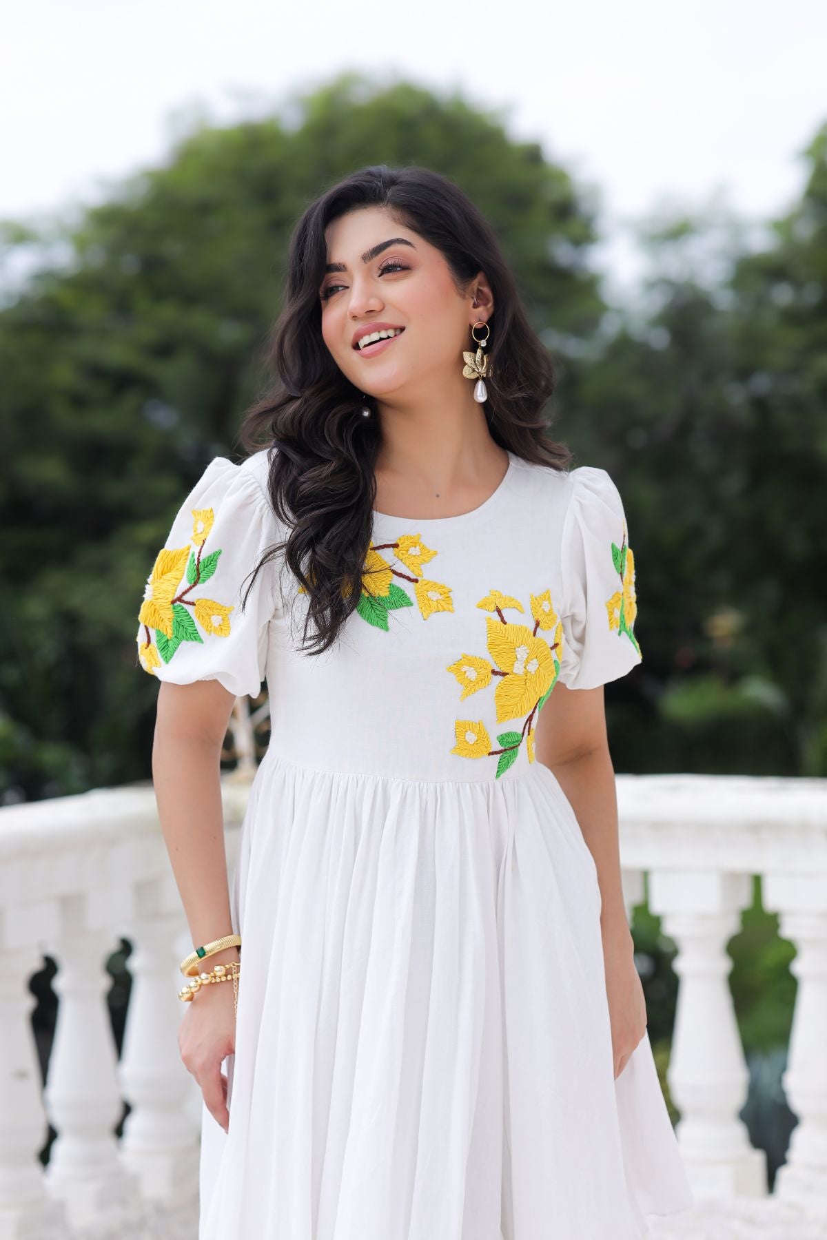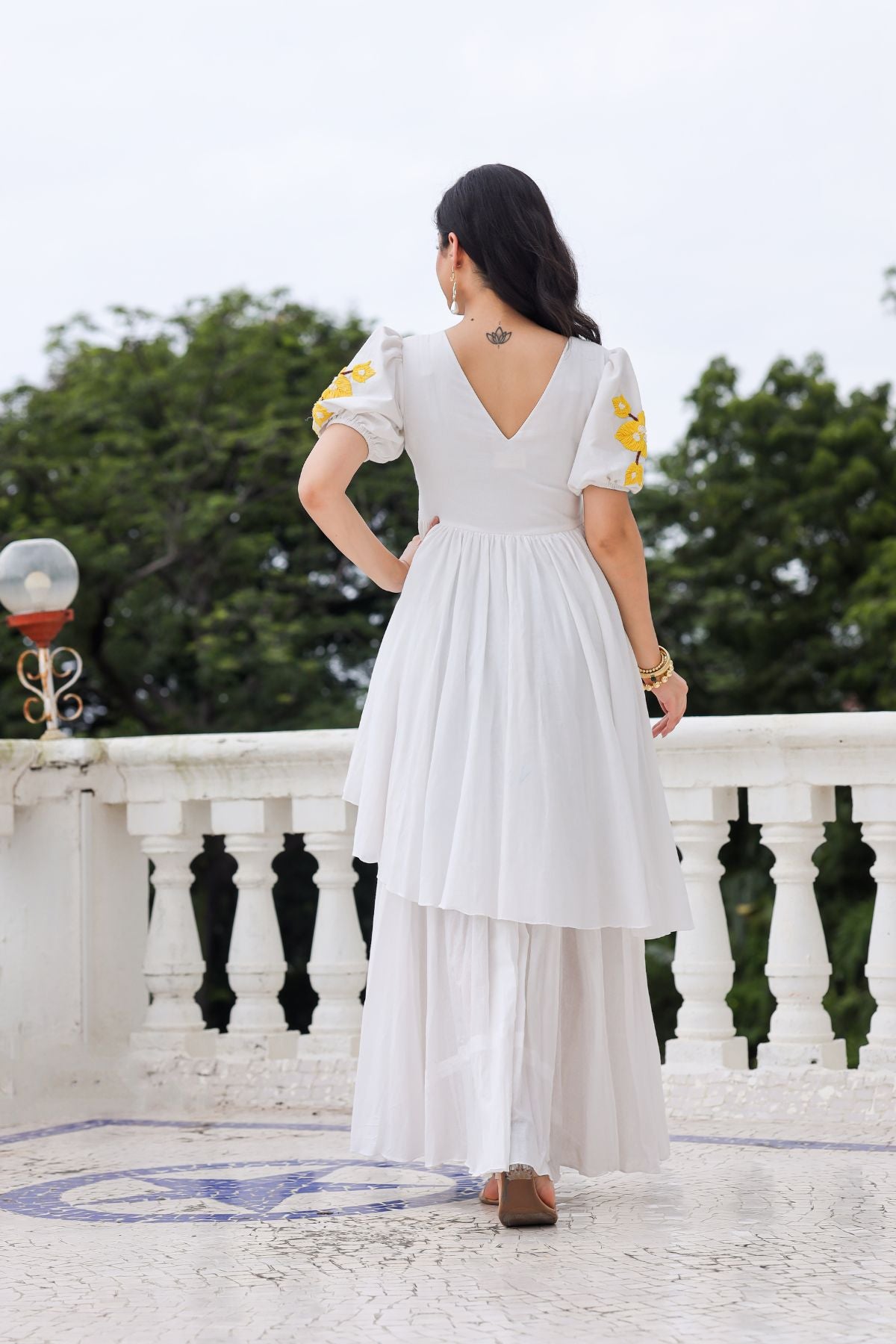 Crafted from lightweight, eco-friendly Mul cotton, this Long white dress is perfect for any destination. It features hand-embroidered puff sleeves and yoke, flair with a 2-layered gathering on the waist, and a side zip for a perfect body fit. Wear this on the beach, resort, or a simple brunch day out with friends and family!
