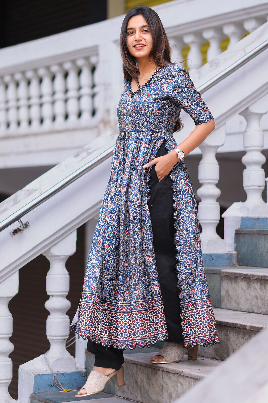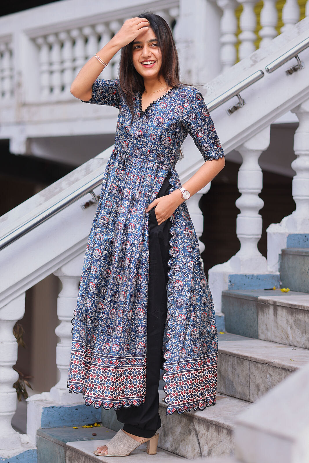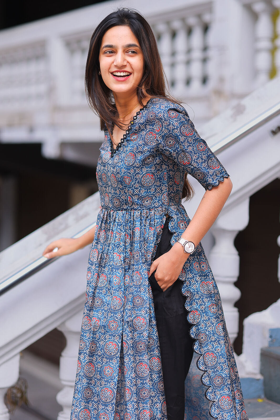 The Yashna Ajrakh Kurta Set is a sleek blue ensemble perfect for daily workwear. This elegant two-piece set features intricate mirrorwork on the neckline and is crafted from premium Manipur fabric with a luxurious Ajrakh print. The kurta and sleeves are adorned with scallop cutwork detailing, with black thread hemming accentuating the edges. Complementing the kurta, the set includes harem-style black pure cotton pants with a side opening, making it a perfect fit for all body types.