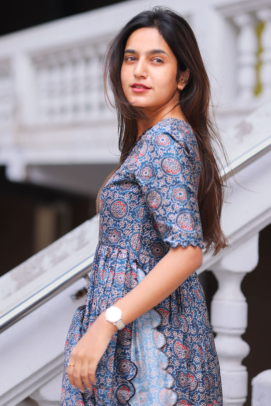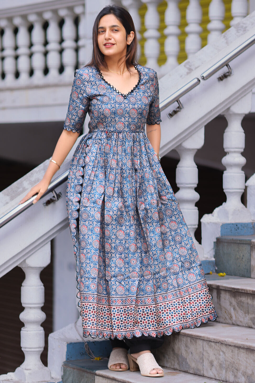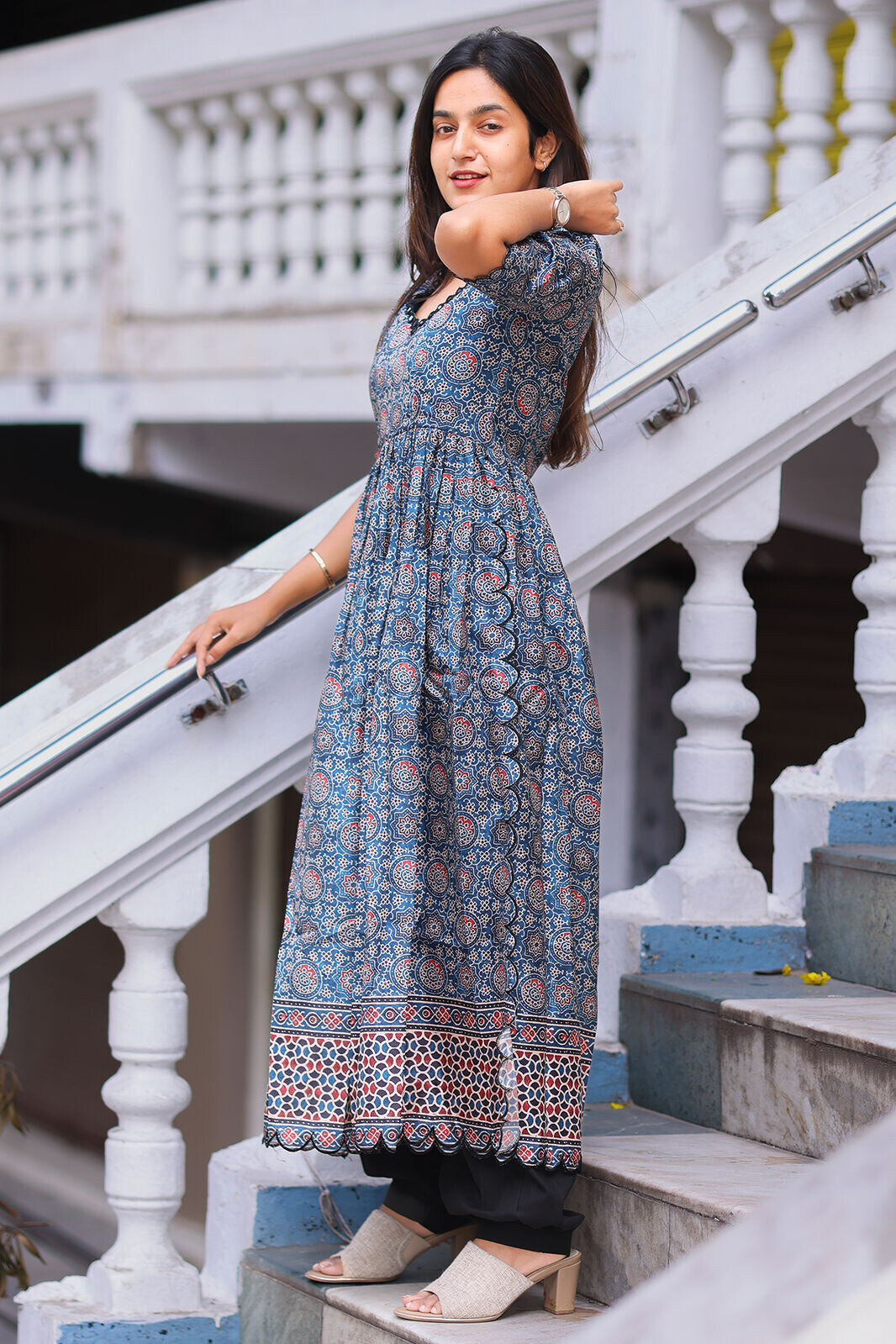 The Yashna Ajrakh Kurta Set is a sleek blue ensemble perfect for daily workwear. This elegant two-piece set features intricate mirrorwork on the neckline and is crafted from premium Manipur fabric with a luxurious Ajrakh print. The kurta and sleeves are adorned with scallop cutwork detailing, with black thread hemming accentuating the edges. Complementing the kurta, the set includes harem-style black pure cotton pants with a side opening, making it a perfect fit for all body types.