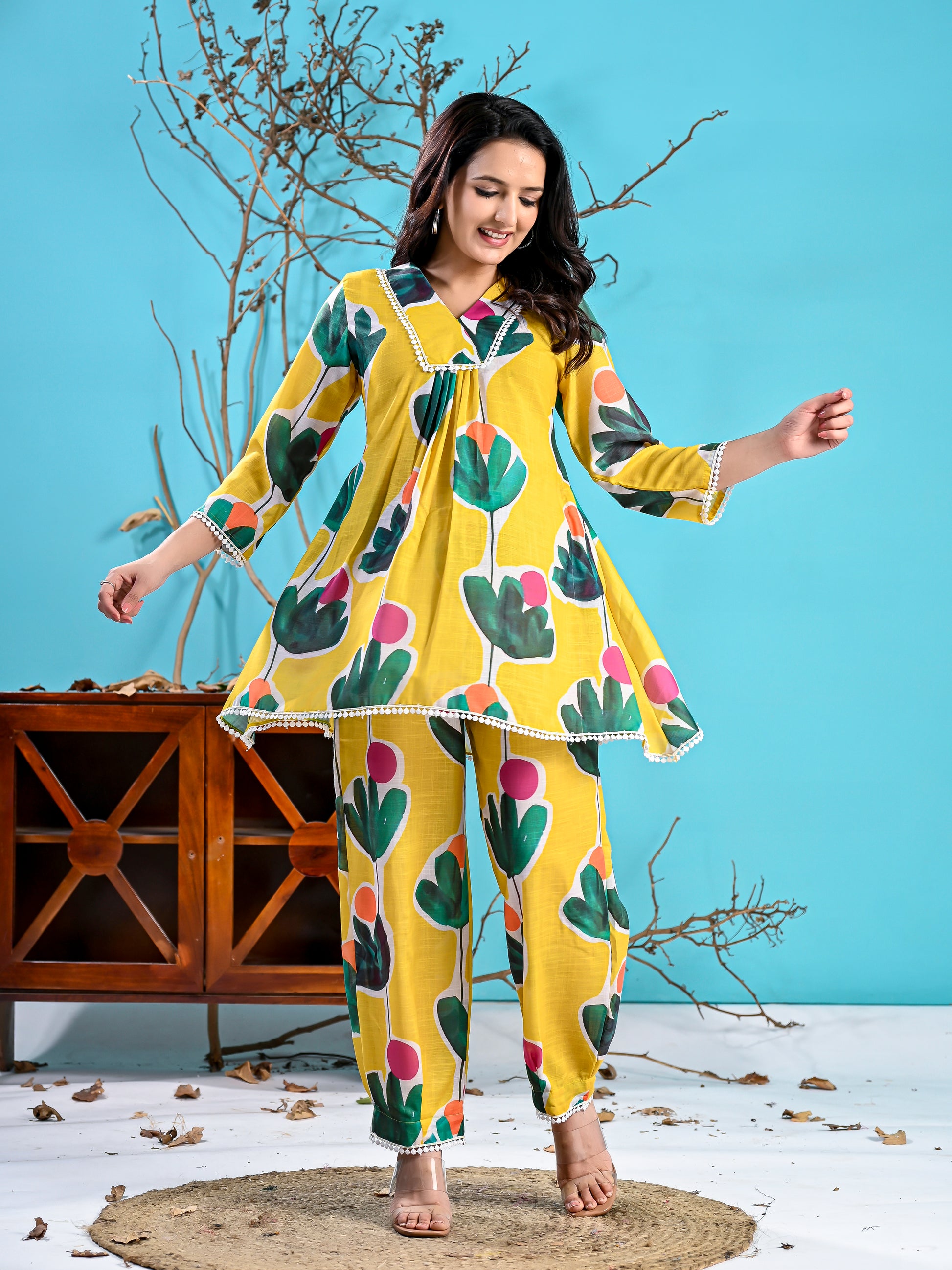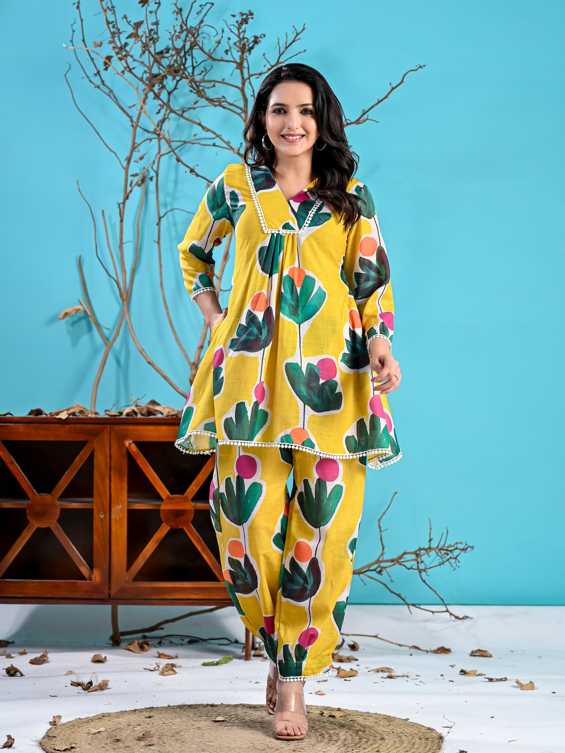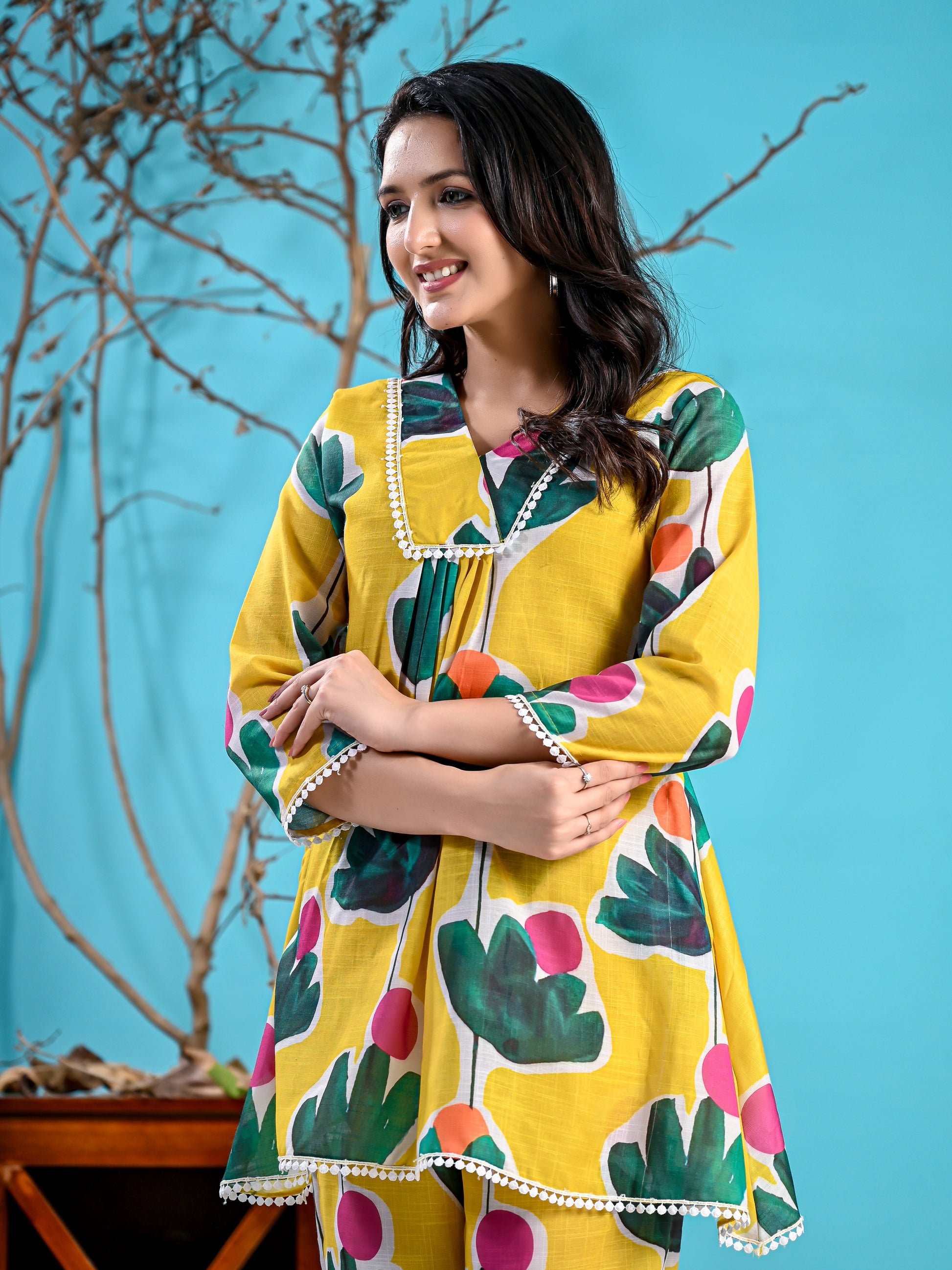 Introducing our exquisite mustured co-ord Set, a harmonious blend of elegance and comfort. The short printed kurta features an overlapping yoke, creating a sophisticated silhouette. Delicate gathers at the yoke add a touch of finesse, while lace detailing at the neckline and sleeves elevates the ensemble with a hint of allure. Crafted for both style and convenience, the Kurta is equipped with inseam pockets, offering functionality without compromising on style. The accompanying printed pants exude charm with their intricate pleats and vibrant print. Designed for a perfect fit, boast an ensuring comfort throughout the day.
